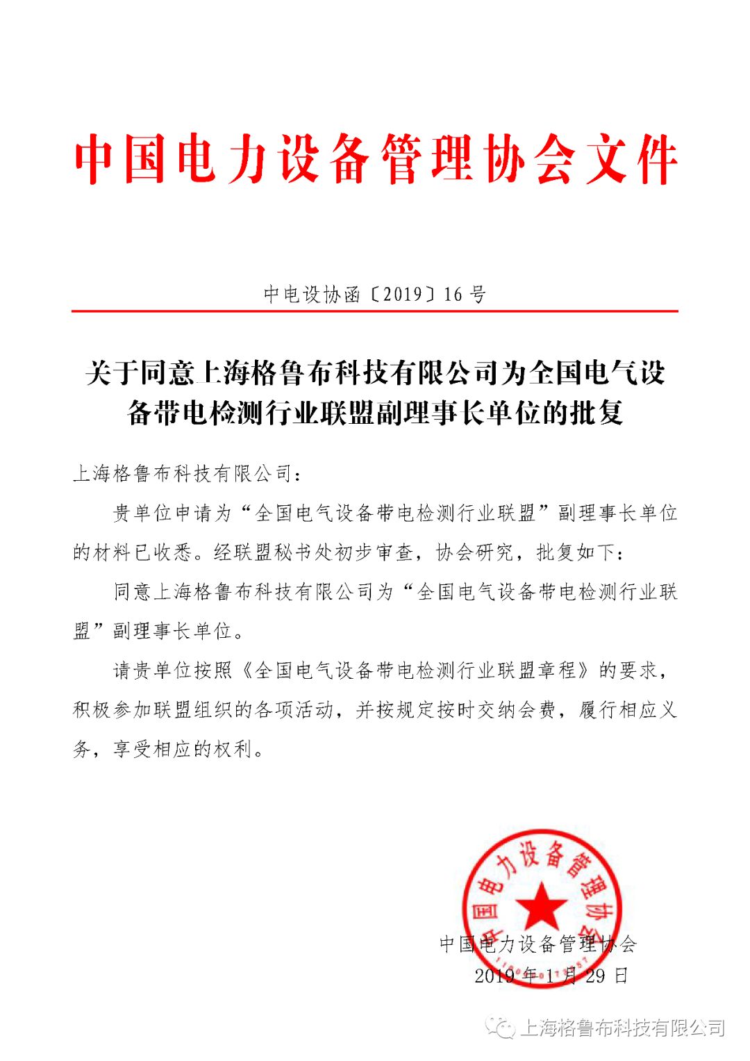 关于同意上海格鲁布科技有限公司为全国电气设备带电检测行业联盟副理事长单位的批复(2019)16号