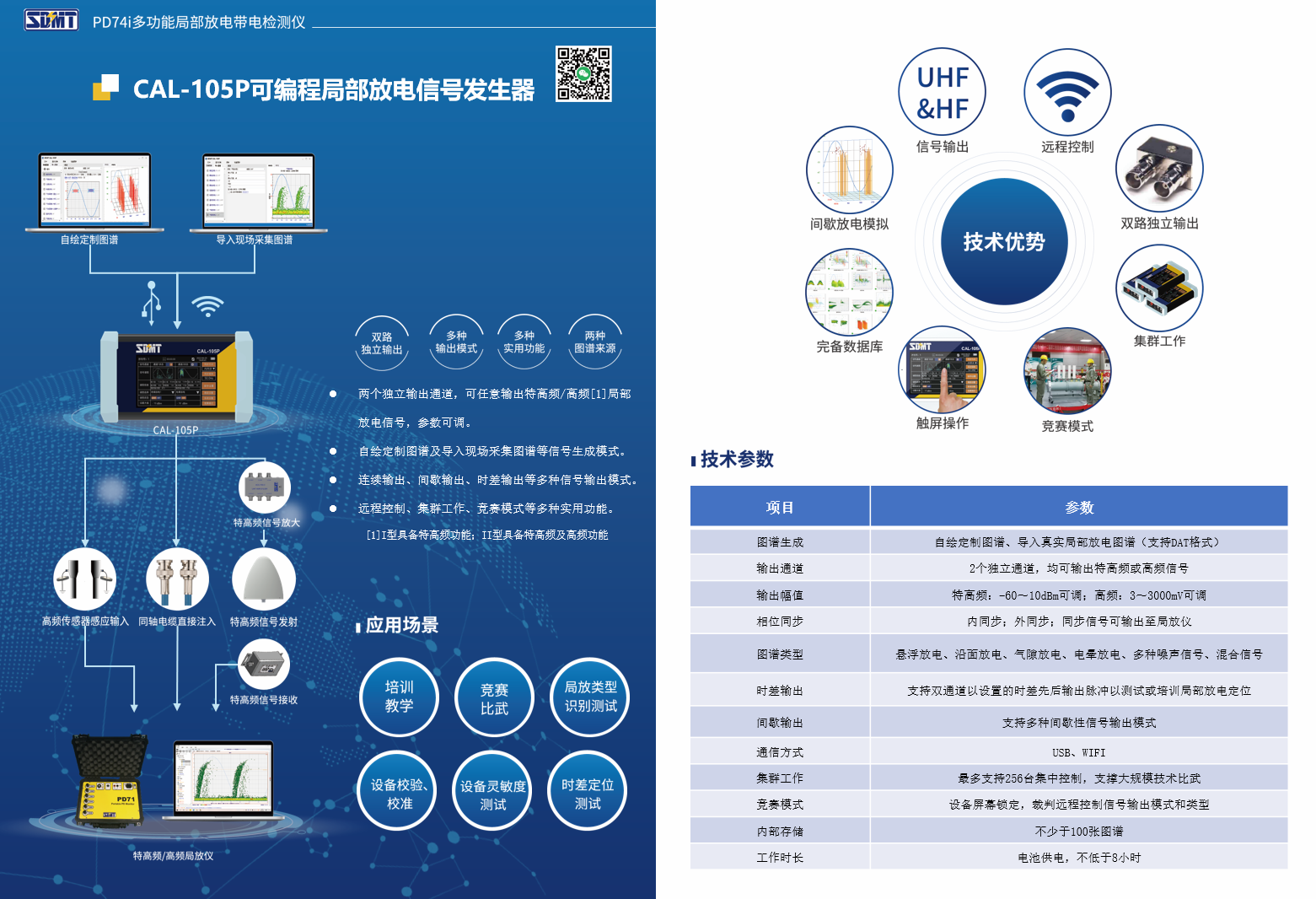 两个独立输出通道,可任意输出特高频/高频[1]局部放电信号,参数可调。 自绘定制图谱及导入现场采集图谱等信号生成模式。 连续输出、间歇输出、时差输出等多种信号输出模式。 远程控制、集群工作、竞赛模式等多种实用功能。