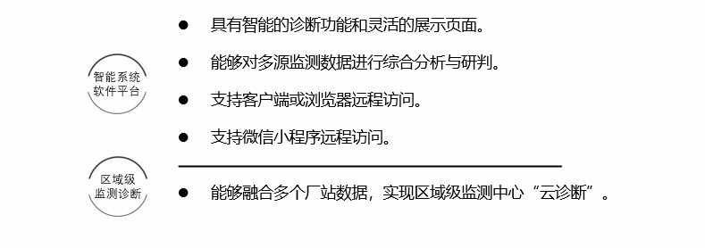 - 系统由各类高灵敏度传感器、信号采集单元、后台诊断平台和网络组件组成,可根据需求配置监测功能。