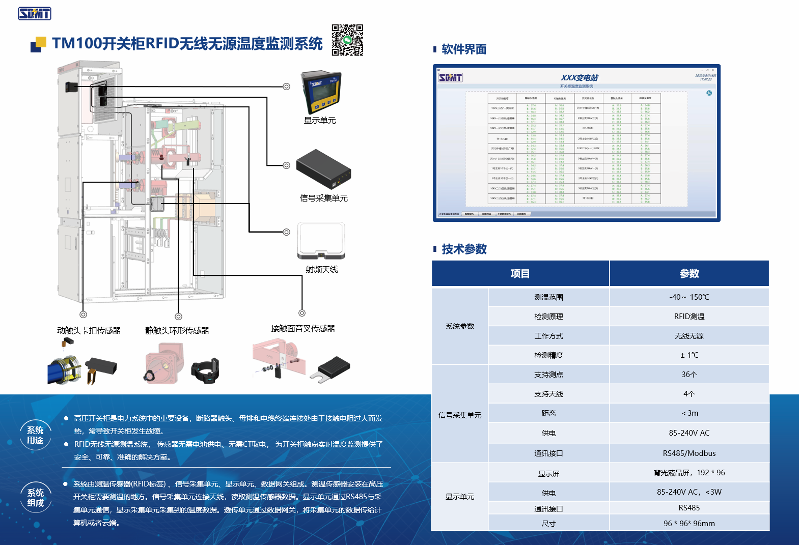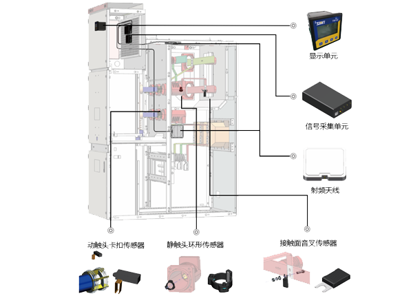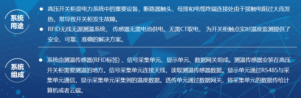 高压开关柜是电力系统中的重要设备,断路器触头、母排和电缆终端连接处由于接触电阻过大而发热,常导致开关柜发生故障。 RFID无线无源测温系统, 传感器无需电池供电、无需CT取电, 为开关柜触点实时温度监测提供了安全、可靠、准确的解决方案。